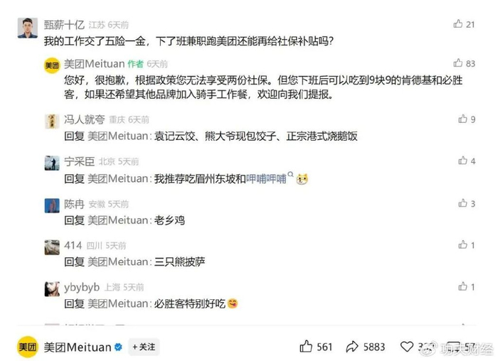 在美团宣布参保补贴全国覆盖的推文下,评论区有网友询问,已经有工作能否领补贴,美团回复按照政策无法享受两份社保,但是下班后可以吃到9块9的肯德基和必胜客,如果还希望别的品牌加入“骑手工作餐”,欢迎提报。